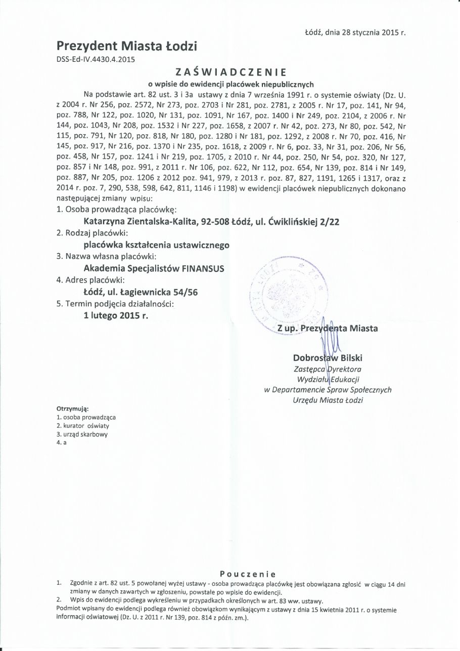 Z dniem 1.02.2015 r. Akademia Specjalistów FINANSUS stała się Niepubliczną Placówką Kształcenia Ustawicznego i Praktycznego, zgodnie z otrzymanym zaświadczeniem i wpisem do Rejestru Szkół i Placówek Oświatowych (RSPO) pod nr 126857.